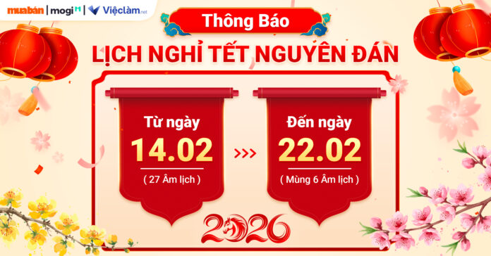 Thời gian nghỉ: Từ Thứ 7, ngày 14/02/2026 (tức 28 Tết) đến hết Chủ nhật, ngày 22/02/2026 (tức Mùng 6 Tết)